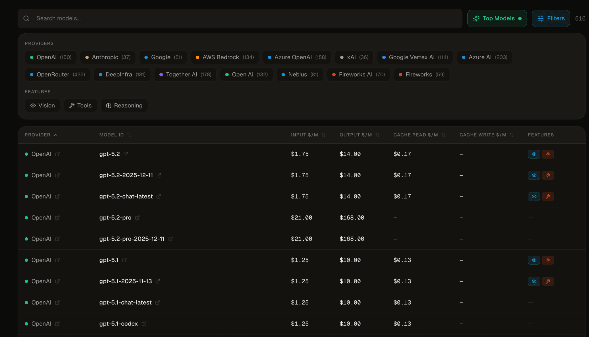 Provider-agnostic — Pricing for 2,000+ models across 50+ providers