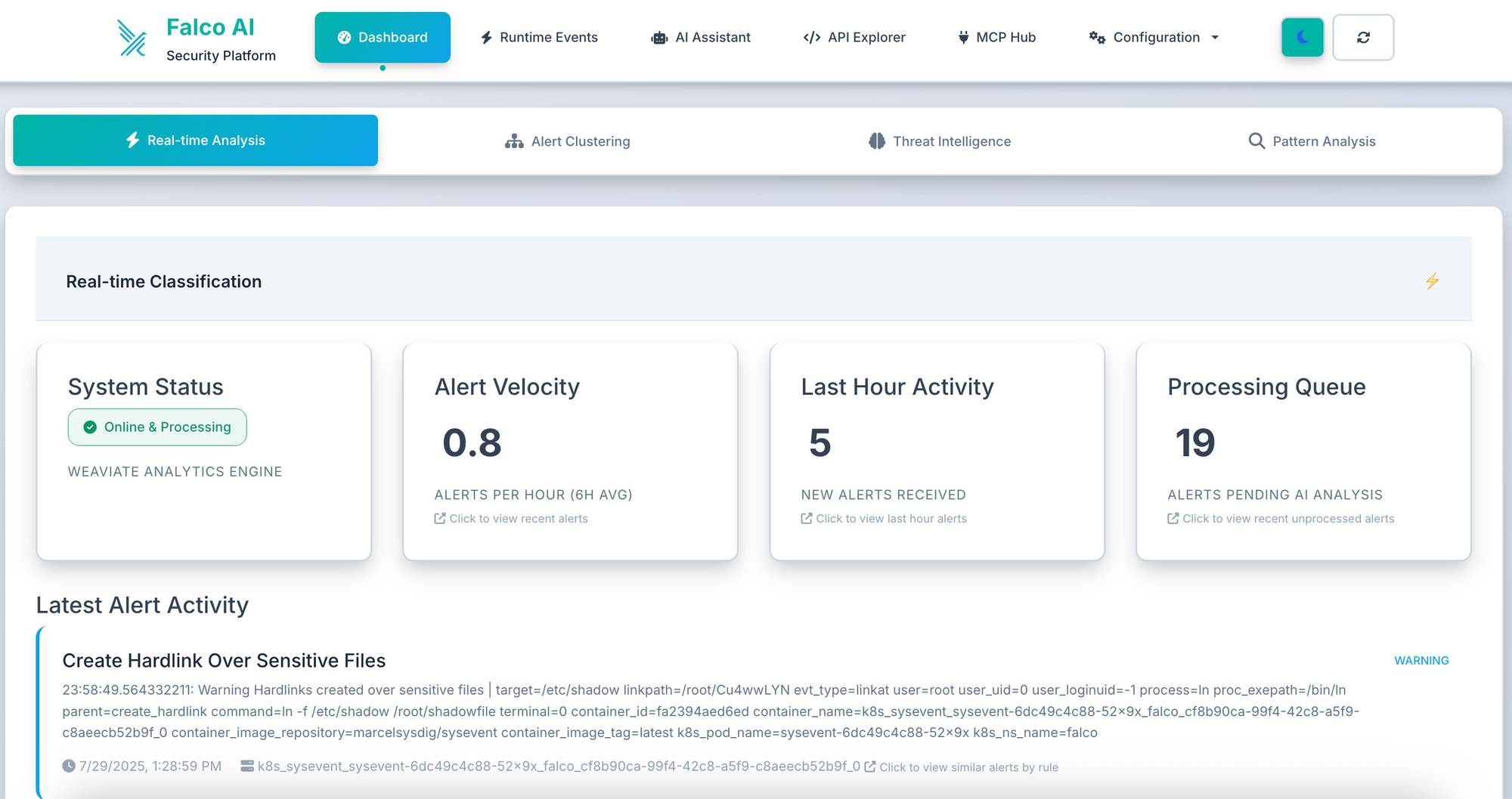 open http://localhost:8080/dashboardProduction Readiness: While experimental, many early adopters are successfully running Falco Vanguard in production. However, thoroughly test in your environment and have rollback plans ready.