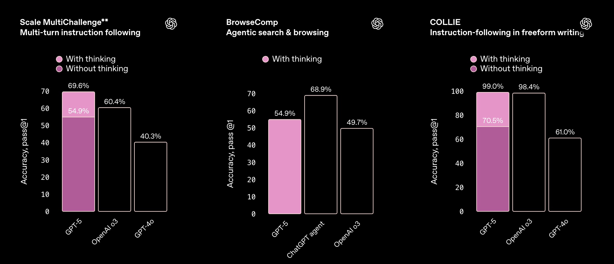 - GPT-5 shines when extended reasoning is enabled. In multi-turn instruction following and browsing tasks, its “thinking” mode pushes accuracy significantly higher, though the baseline without it can lag. This suggests GPT-5 is more powerful when you configure it for deeper reasoning, but less predictable in lightweight runs.