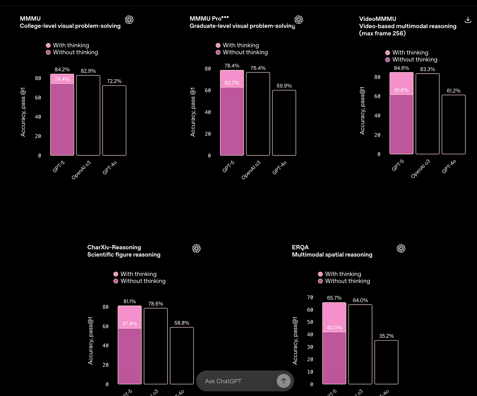 - GPT-5 benefits heavily from its “thinking” mode, which boosts results across scientific reasoning, multimodal tasks, and spatial problems. This allows it to handle complex, multi-step chains of logic more effectively than when running in standard mode. The tradeoff: without reasoning enabled, accuracy can fall off sharply.