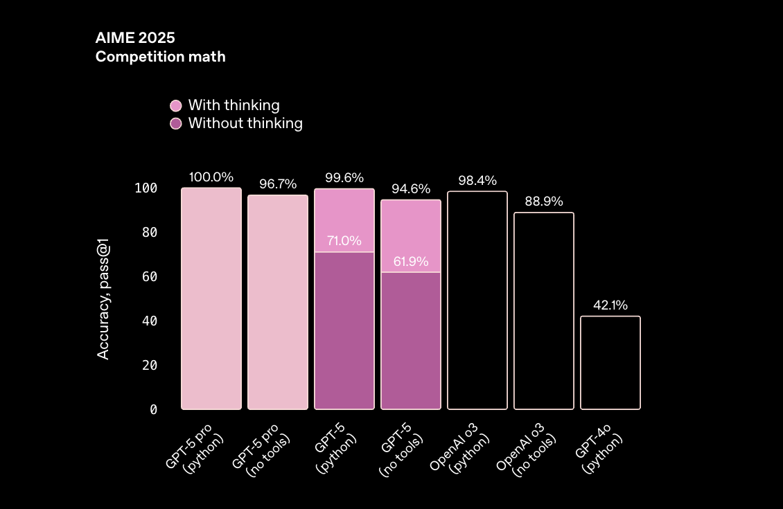 - GPT-5 also achieves near-perfect math accuracy, but only when its reasoning and tool integrations are fully enabled. Without them, accuracy drops more sharply, which highlights how much the model leans on its adaptive reasoning path to achieve top results.