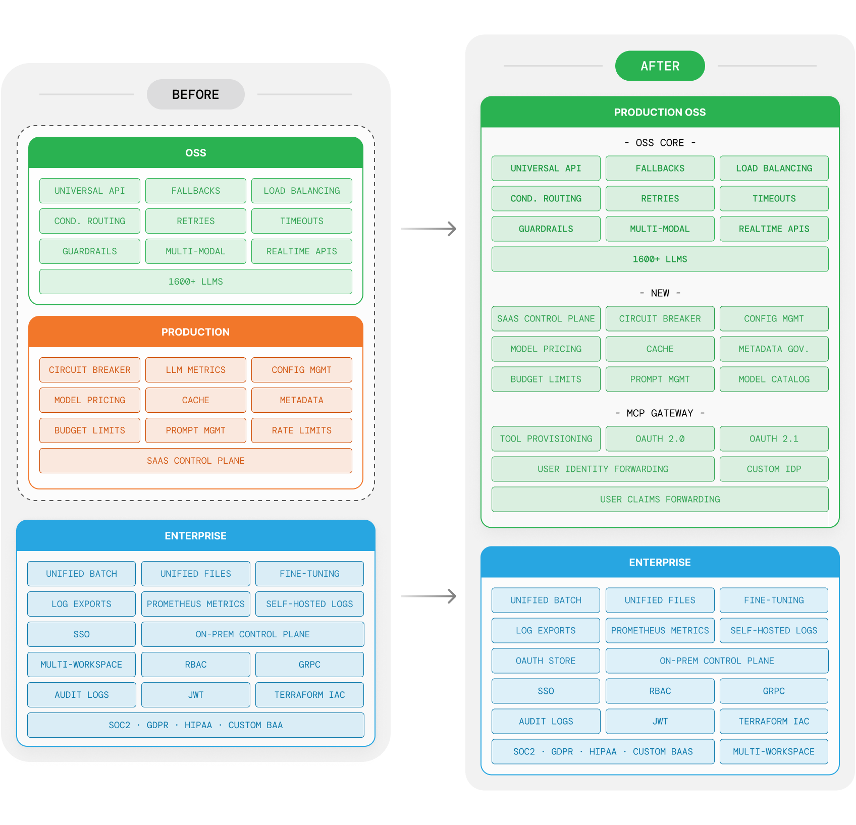 For teams with serious security and compliance requirements, the On-Prem Enterprise Gateway adds gRPC, SSO, SCIM, AWS KMS, RBAC, JWT, audit logs, multi-workspace, and full SOC2/GDPR/HIPAA compliance.