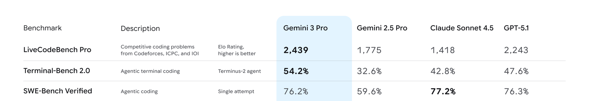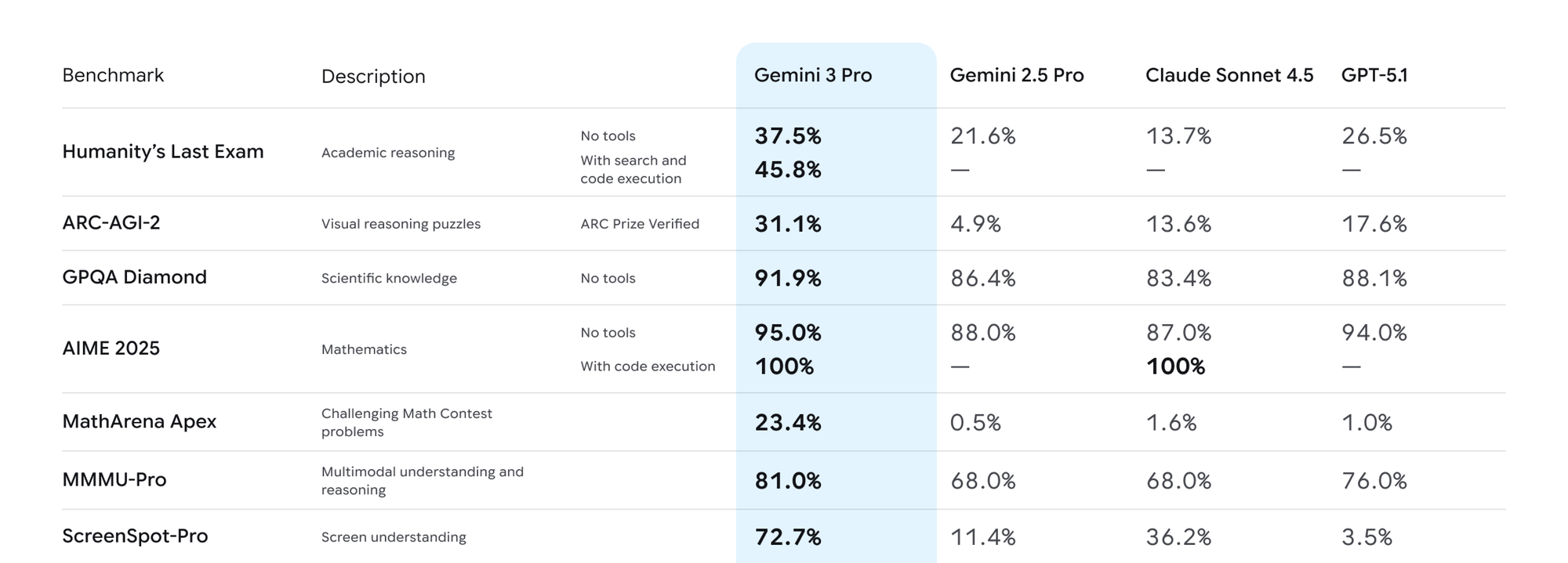 Gemini 3.0 delivers strong results across academic and competition-style reasoning benchmarks. It leads on GPQA Diamond, ARC-AGI-2, MMMU-Pro, and AIME 2025, pointing to deeper scientific knowledge, better visual–logical reasoning, and stronger performance on problems that require multi-step deduction without tools.