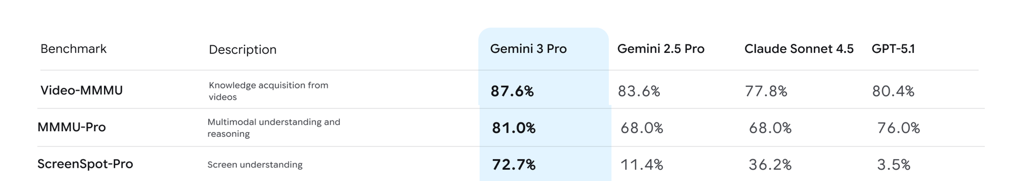 Gemini 3.0 is strong across multimodal reasoning, leading on MMMU-Pro, Video-MMMU, and ScreenSpot-Pro. These benchmarks measure how well a model interprets images, charts, video frames, and mixed visual-text inputs. Gemini’s higher scores suggest stronger cross-modal grounding and better consistency when tasks require linking visual details to structured reasoning.