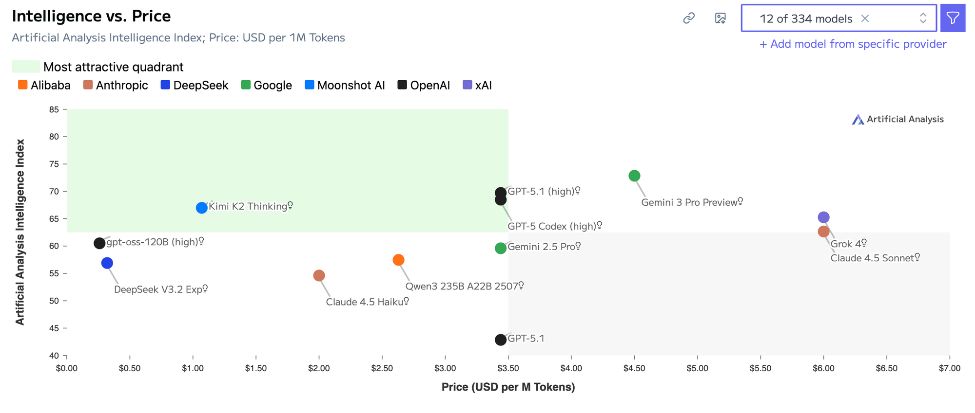 GPT-5.1 lands in a more balanced price–performance position. It is still expensive relative to mid-tier models, but it sits inside the chart’s attractive efficiency quadrant. The model offers high reasoning and coding performance without drifting into the premium pricing range that Gemini 3.0 occupies.