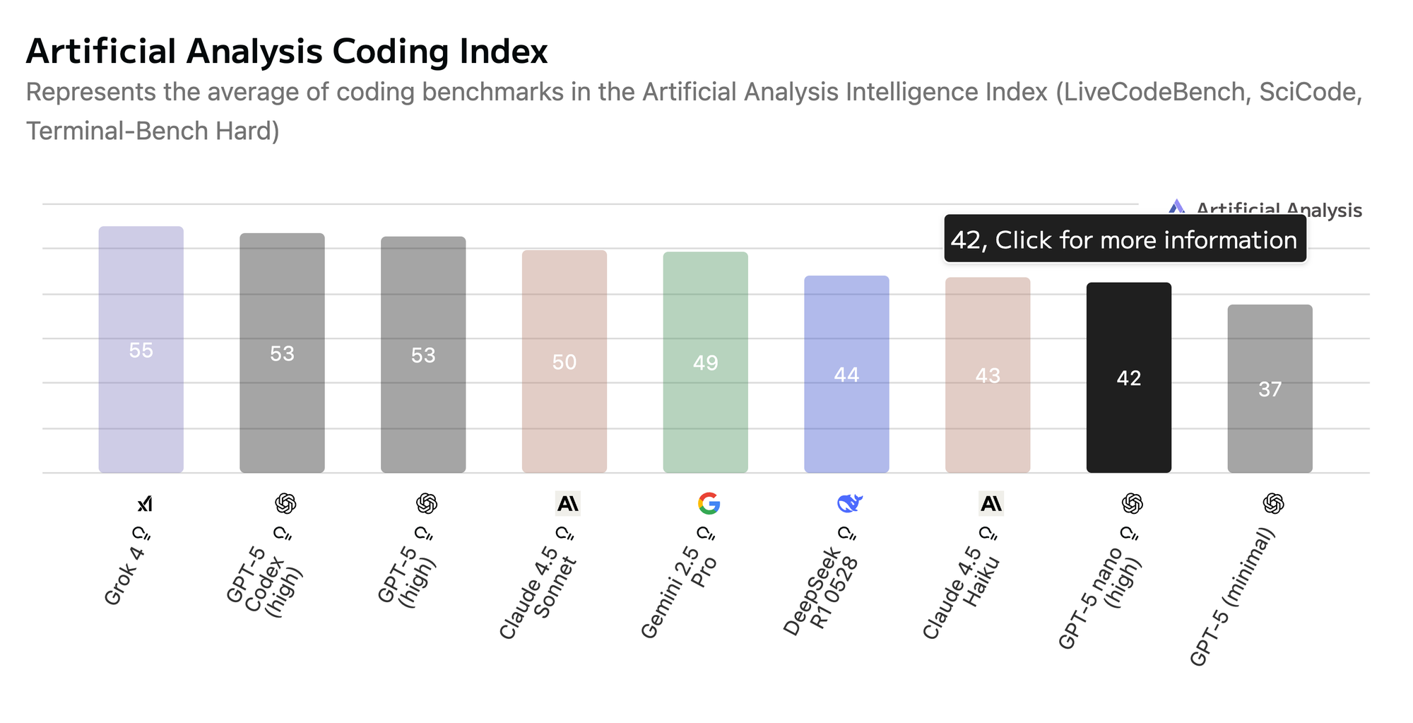 GPT-5 Nano: GPT-5 Nano sits squarely in the “efficiency-first” category. It trades depth for speed, excelling in shorter completions, boilerplate generation, and in-editor code suggestions where response time is critical. However, its lower aggregate coding score suggests it may struggle with more complex debugging or reasoning-heavy refactors.