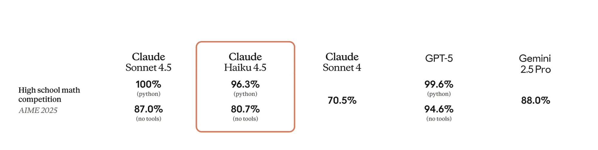 Haiku 4.5 performs strongly on symbolic and competition-style math tasks, showing it can retain structured reasoning even with limited context. It generalizes well on step-by-step logic problems and equation-based reasoning, making it capable in use cases like tutoring, evaluation agents, or analytical workflows without relying on external tools.