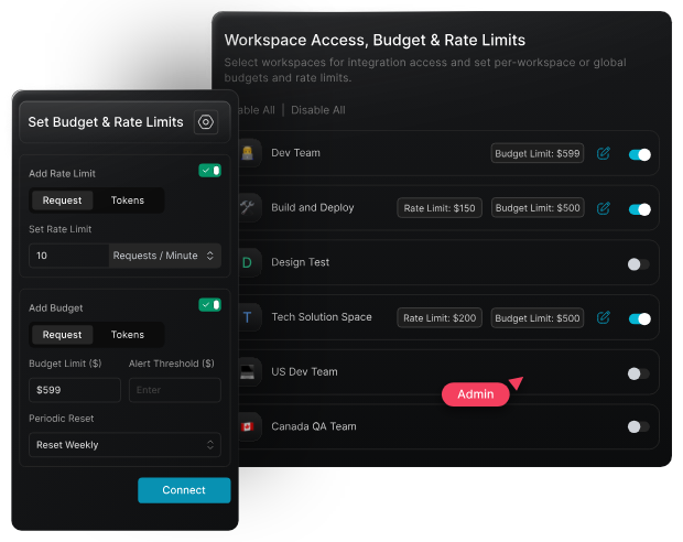 A model catalog allows you to enforce rate limits and budget caps at both the organization and team levels. Instead of relying on per-API configurations scattered across services, you can centrally define how much usage is allowed, by whom, and on which models. This is essential for maintaining control as usage scales across multiple teams.