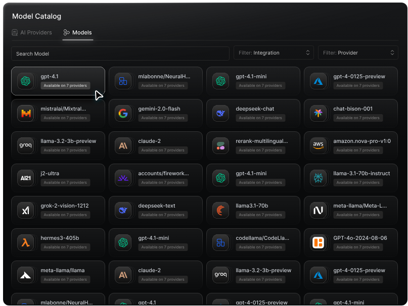 A centralized catalog helps developers discover what models are available and what they’re best suited for. Instead of hunting through provider documentation or internal Notion pages, teams can filter models by capabilities (e.g., supports vision, low-latency, low-cost) and select the best one for the task at hand.