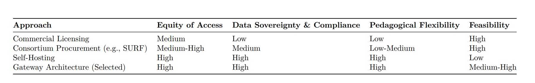 Self-hosting open-source models offered maximum sovereignty and control. In practice, however, the operational burden of maintaining GPU infrastructure, managing model lifecycles, and keeping pace with frontier capabilities would have diverted resources away from education and research. It also risked isolating students from the models they would encounter in professional environments.