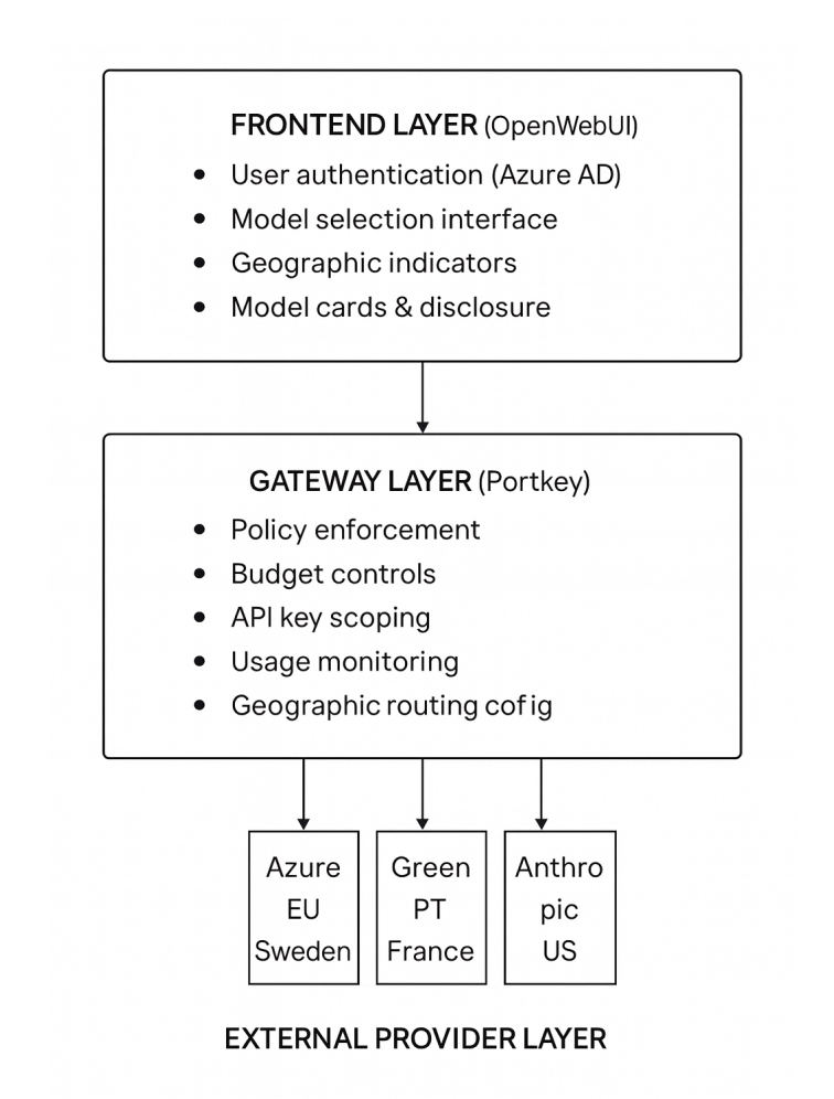 Rather than committing to a single vendor or deployment model, the institution curated a portfolio of AI models spanning commercial providers, EU-hosted infrastructure, and self-operated systems.