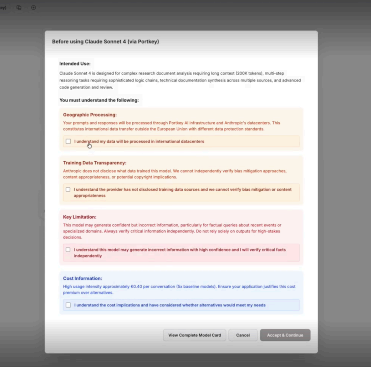 Frontier commercial models were included where pedagogical or research value justified it. Providers such as Anthropic and OpenAI remained important for curriculum relevance and advanced research, even when EU hosting was not available. In those cases, the platform flags non-EU processing clearly and requires explicit user acknowledgment before access.