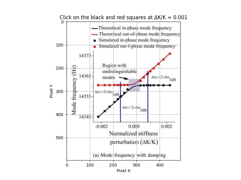 3. Code_analysis_1: Digitally extract the two simulated frequency values at ΔK/K=0.001 by applying a graph‐digitization algorithm to the image.