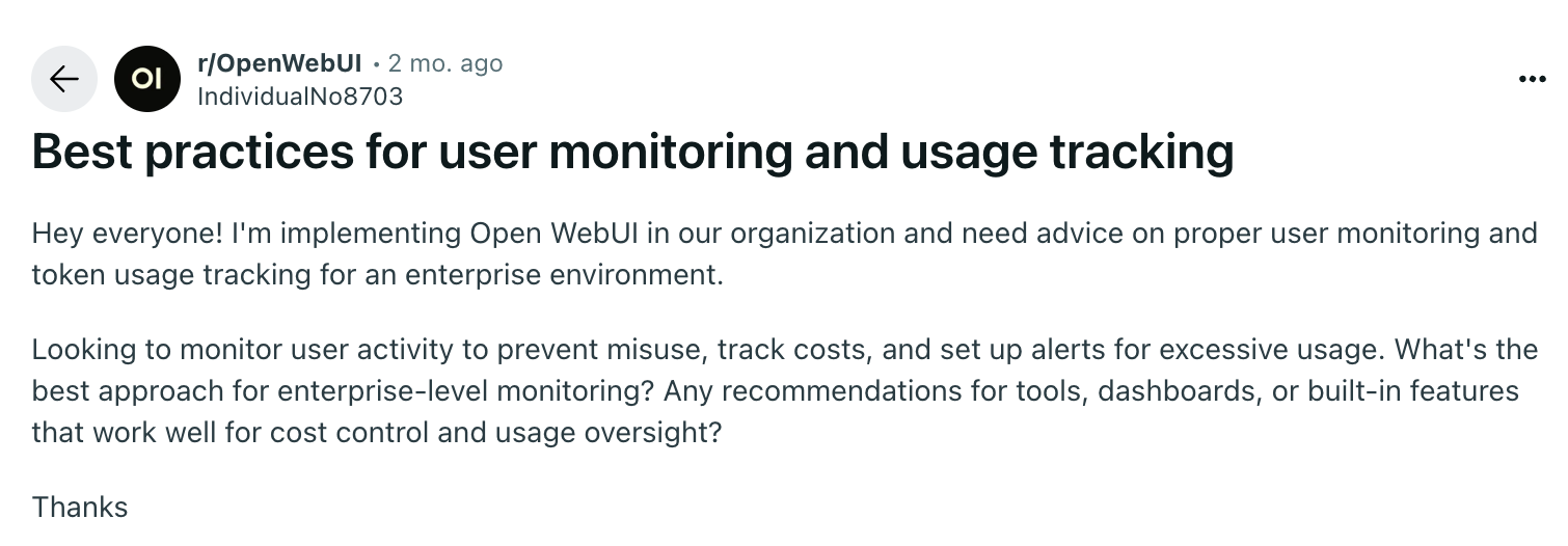 As OpenWebUI sees broader adoption across teams, enterprises need more visibility, control, and governance around how LLMs are being used. Cost tracking, access control, usage analytics, and compliance are critical for safe and scalable deployment.