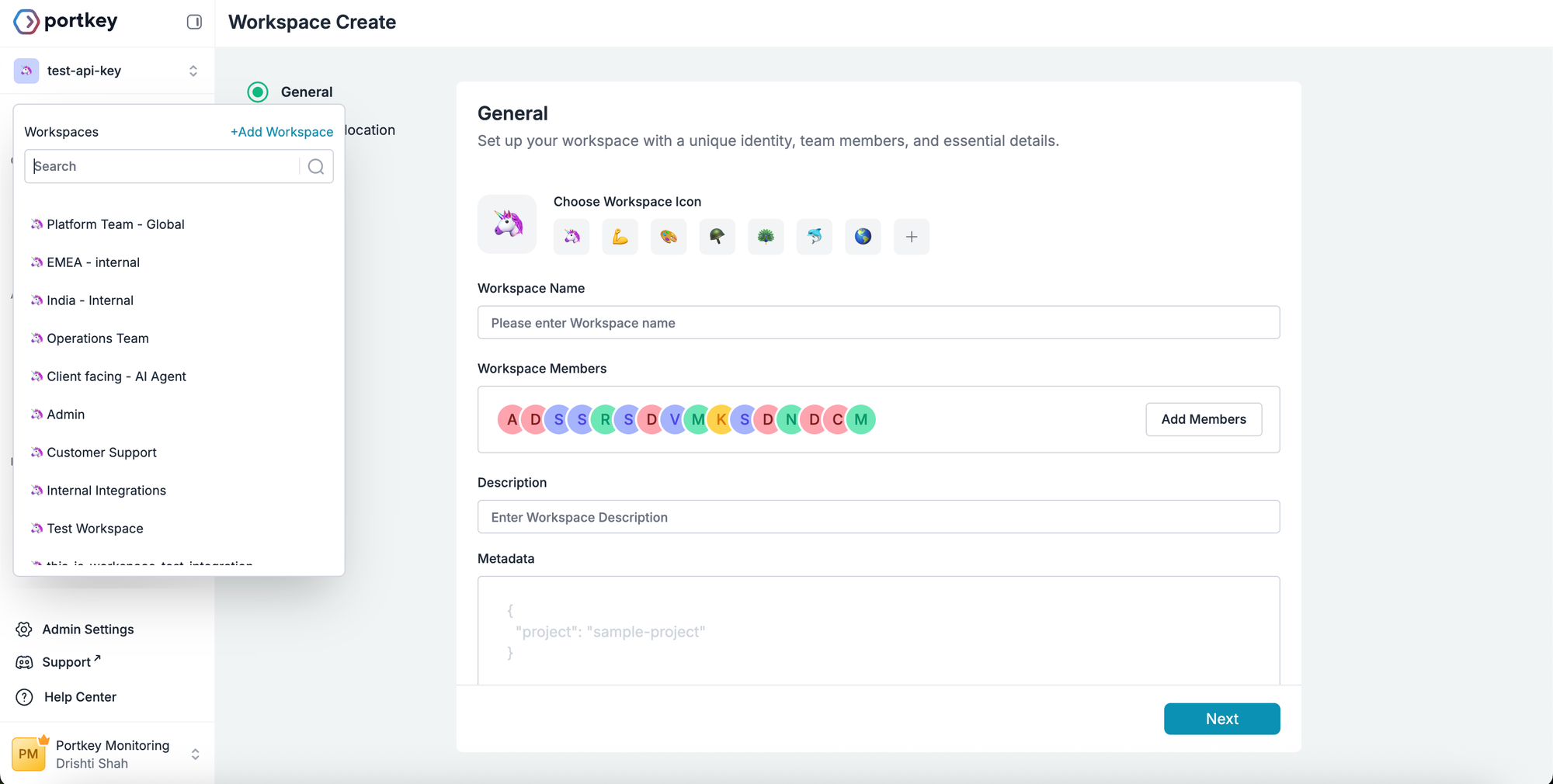 - Everyone added to a workspace has a default user key. To create a new one, go to API Keys from the left panel > Create