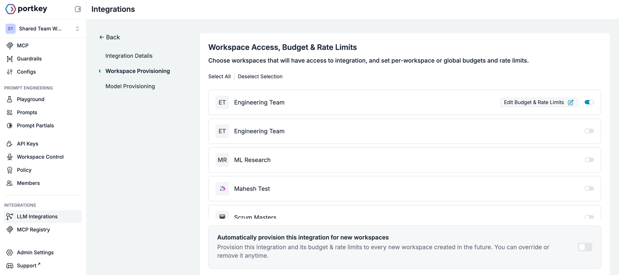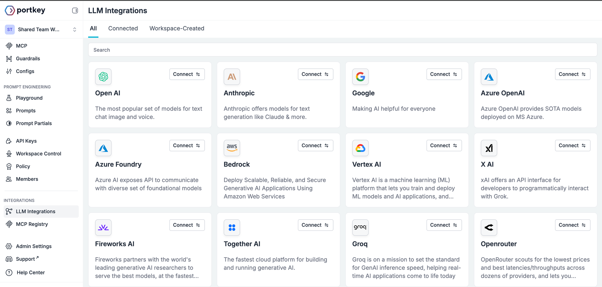 └─────────────────────────────────────────────────────────────┘Each team gets their own workspace and API key. Portkey handles routing, budget enforcement, and tracking, all while you maintain a single set of provider credentials.