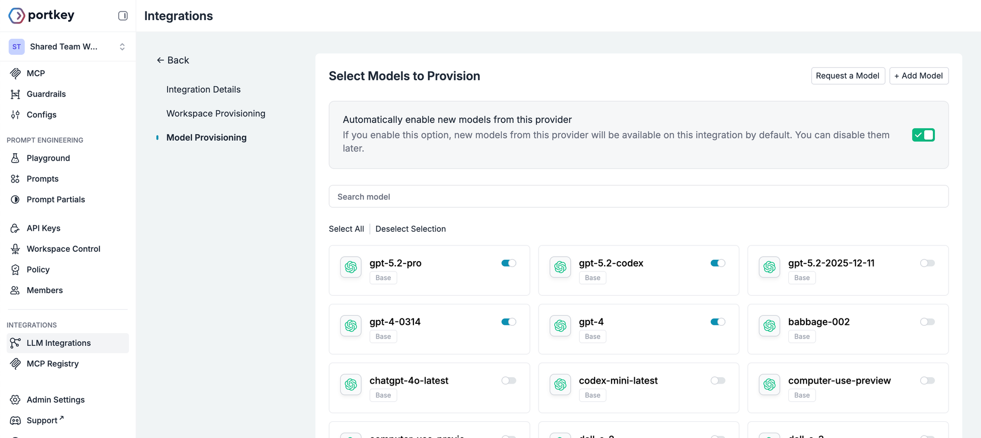 - Go to Integrations > Model Provisioning > enable the models > Save