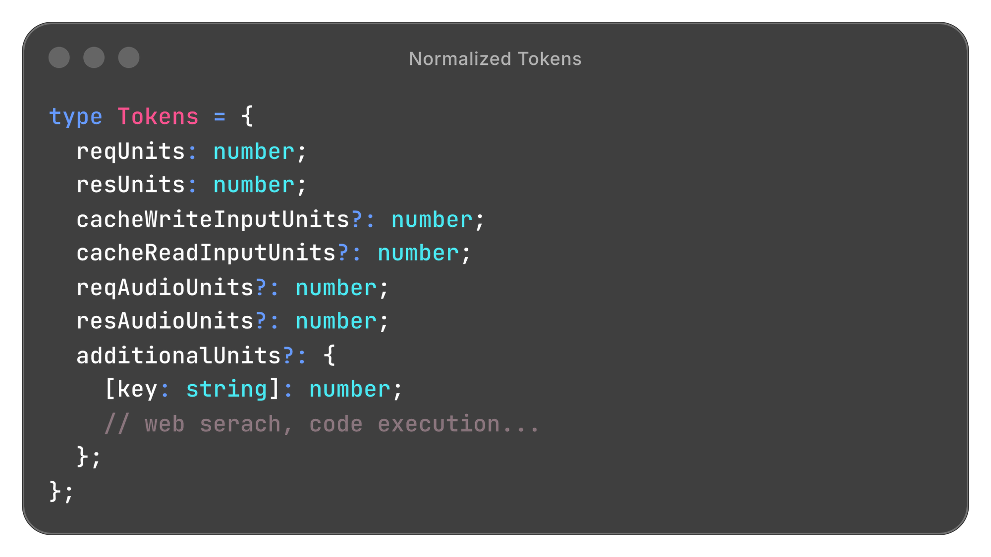 This flows through the system for every request, regardless of provider. The additionalUnits map is what lets us handle new billing dimensions (web search, grounding, tool use) without schema changes. They just become new keys.