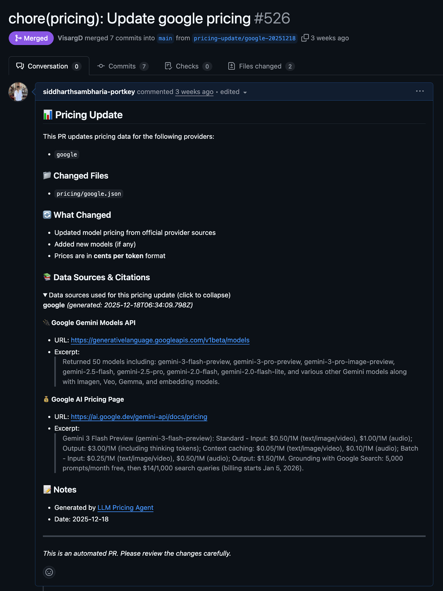 The agent loads skill files, fetches model lists, scrapes pricing sources, formats everything to schema, and opens PRs with citations. It costs about $2–3 per provider run. Novel pricing structures still confuse it. Humans handle judgment calls. But it covers the tedious work that was eating up our time.