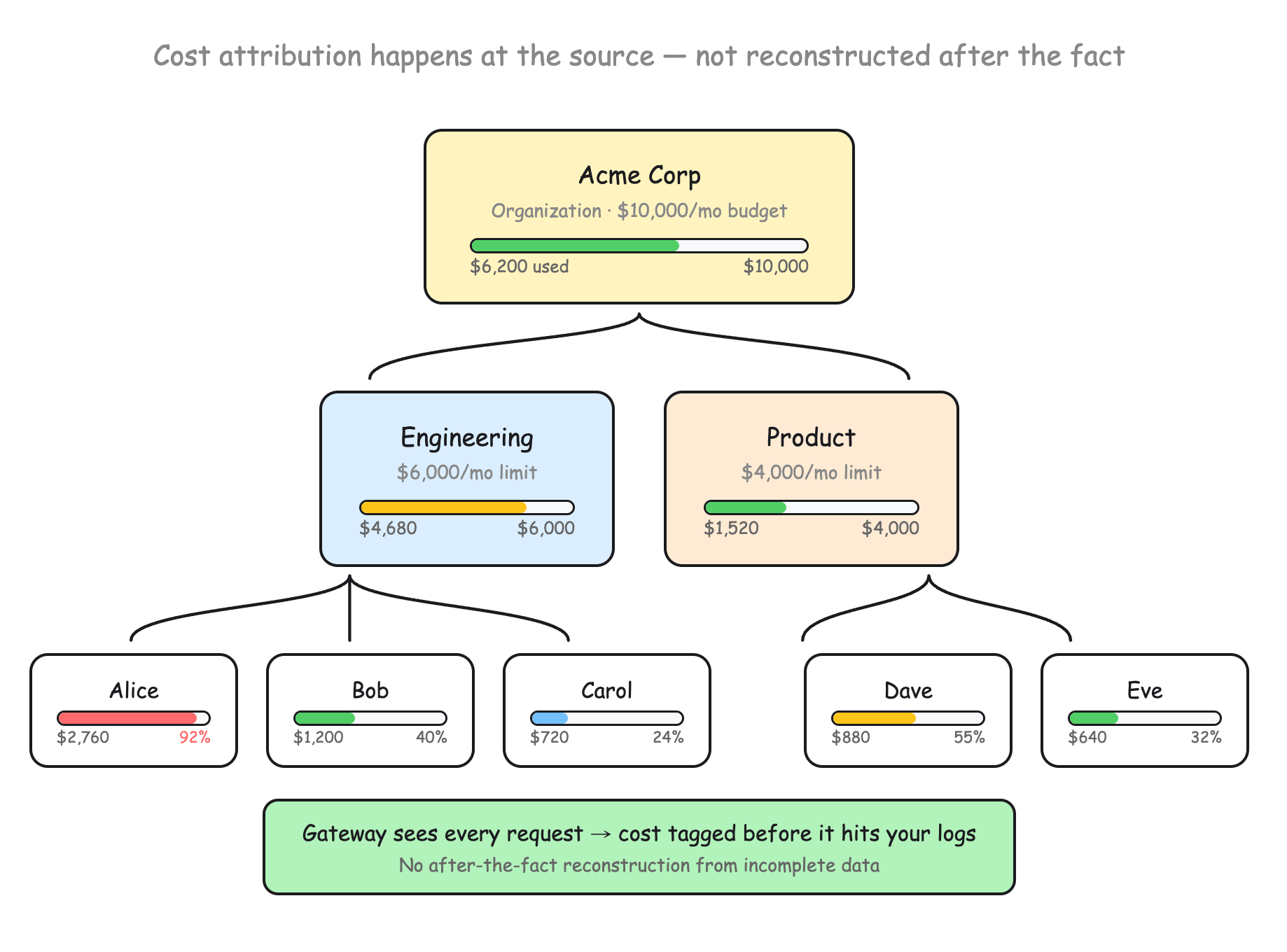 The gateway normalizes every provider response into a single cost structure. Model identifiers get resolved, usage gets normalized, and cost gets tagged per-team and per-user at the routing layer, before it hits your logs. That's what makes real-time budget enforcement possible.