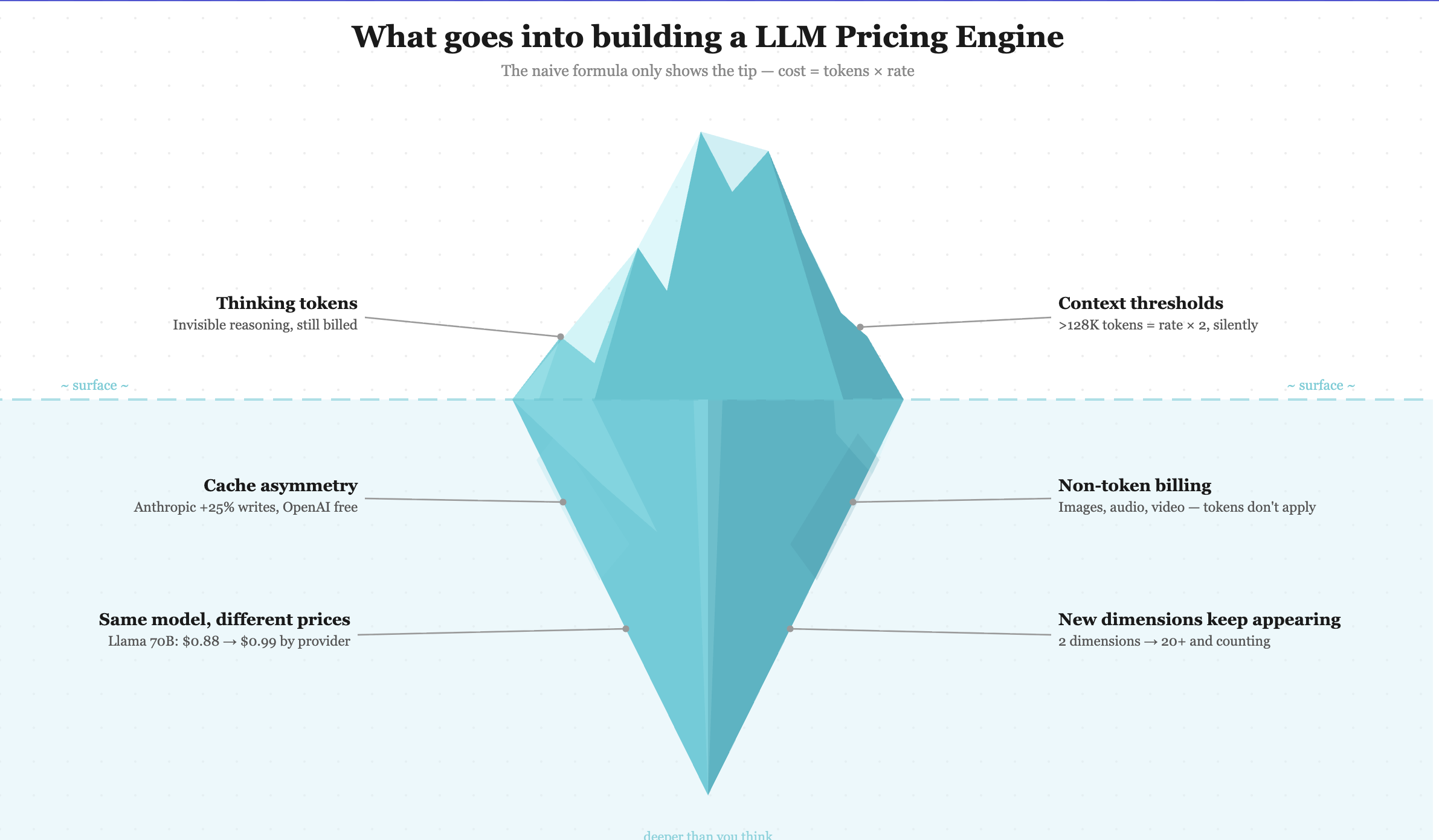 We started with two billing dimensions: input tokens and output tokens. Now there are over twenty. Web search has per-search pricing. Google's Grounding with Search has its own rate structure. Tool use, code execution - each ships with its own cost model, and new ones appear faster than providers update their documentation.
