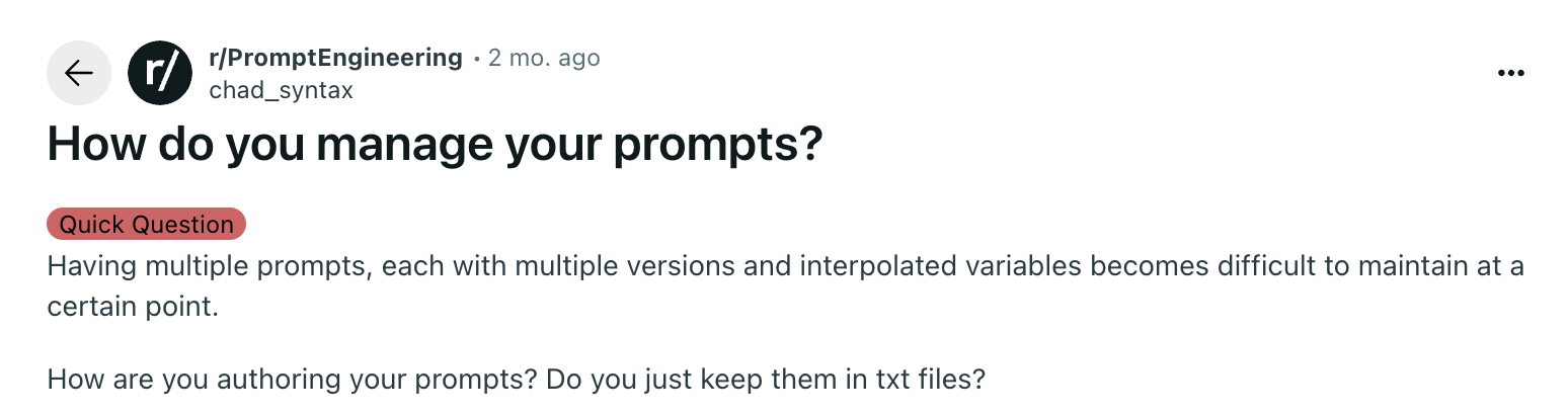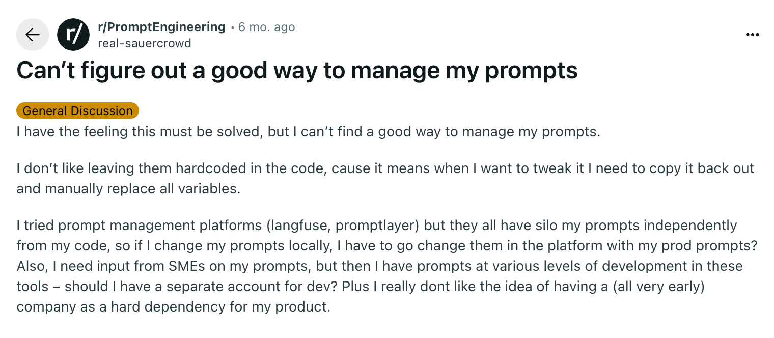 This is exactly what’s leading to slower iteration, inconsistent behavior in production, and a complete lack of confidence in what’s live. For teams working with dozens or hundreds of prompts, this slows you down at the cost of becoming a liability.