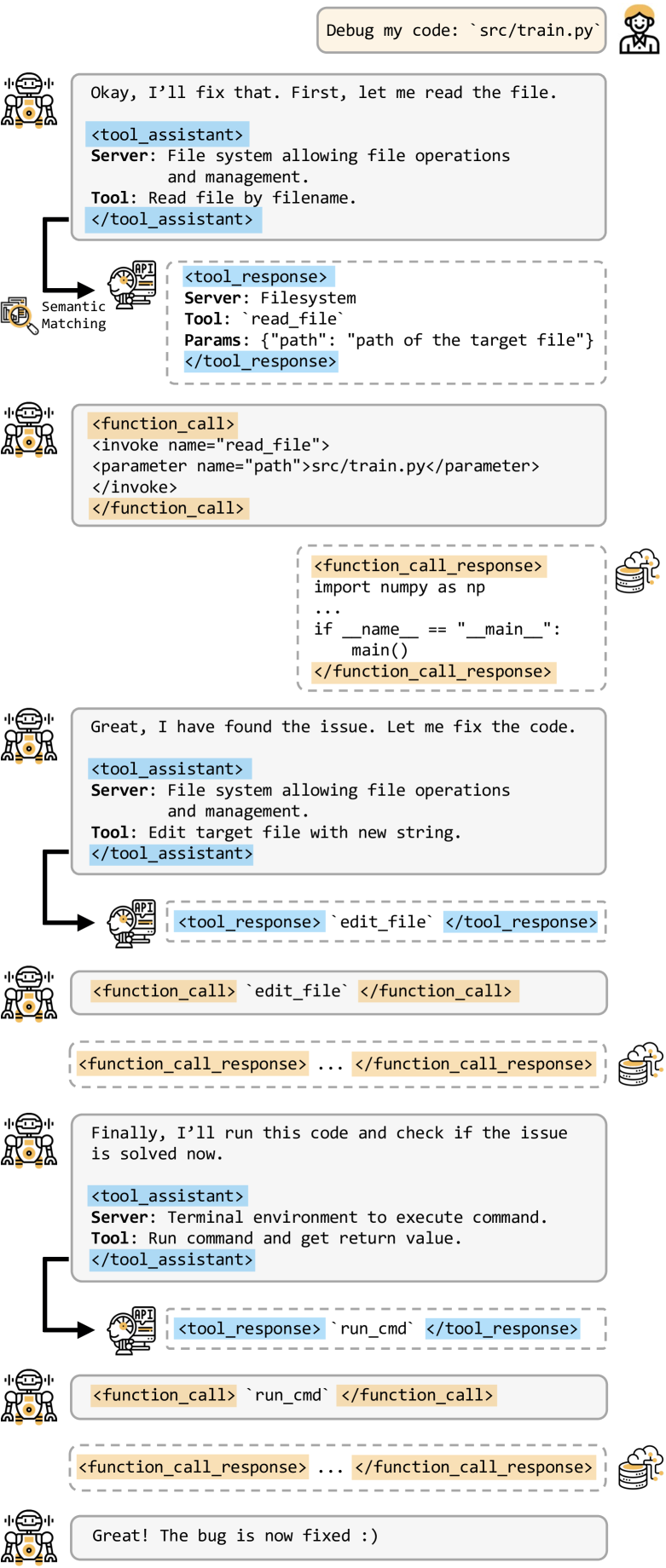 This is especially important for multi-step workflows such as debugging code, where tools from different domains (filesystem, code editing, execution) are needed in sequence.