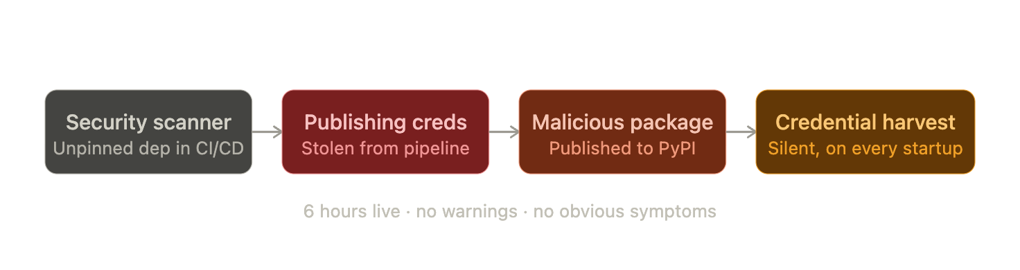 The attackers didn't target the gateway directly either. They started one layer upstream, in a security scanning tool that the gateway's own CI/CD pipeline trusted and ran without version pinning. That single unmanaged dependency handed over publishing credentials. One chain of trust, exploited end to end.