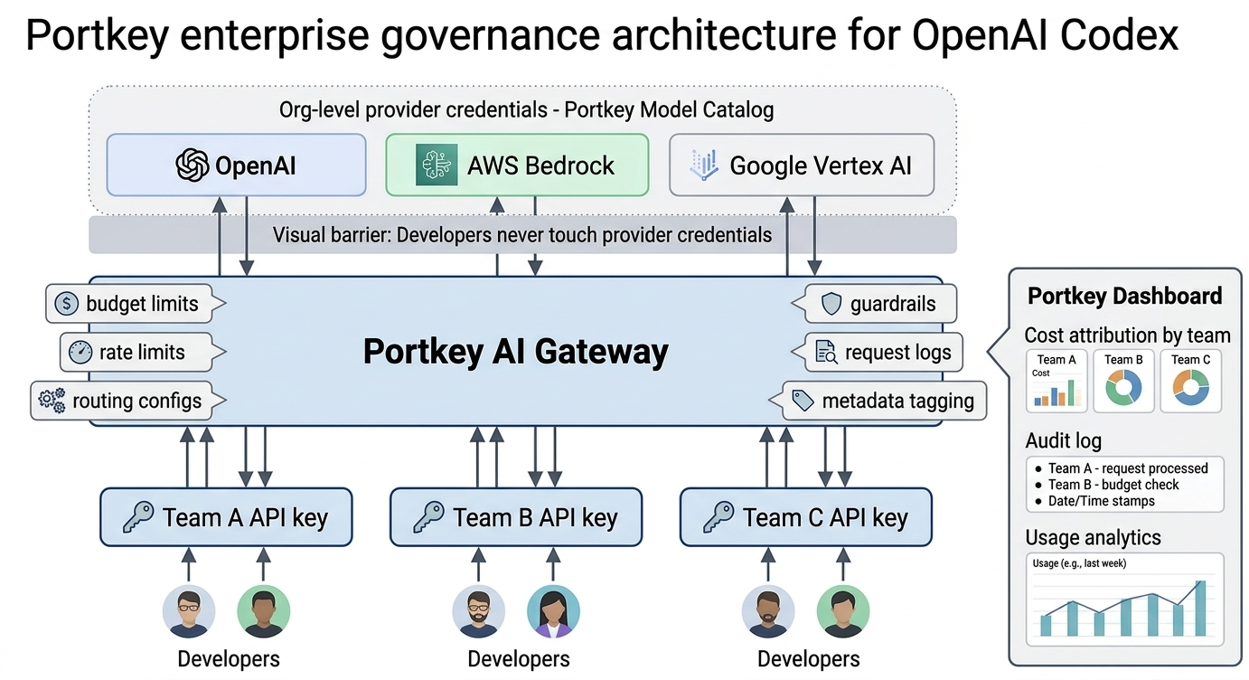 As an AI gateway, Portkey sits between Codex and providers like OpenAI, Anthropic, AWS Bedrock, and Vertex AI, centralizing model access into a single system.
