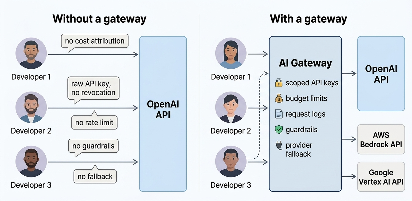 Cost visibility and access control. Usage cannot be attributed after the fact, and API keys are distributed without scope or central revocation.