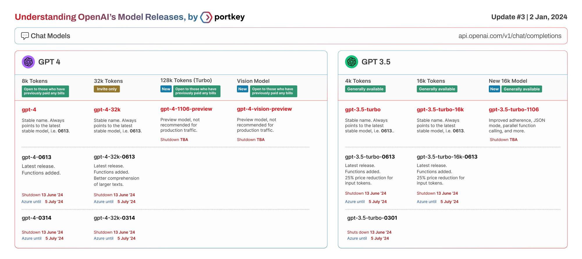 All GPT-4 and gpt-3.5-turbo models remain active. The earliest deprecation is happening on June 13th for gpt-4-0314, gpt-4-0613, gpt-3.5-turbo-0613, gpt-3.5-turbo-0301.