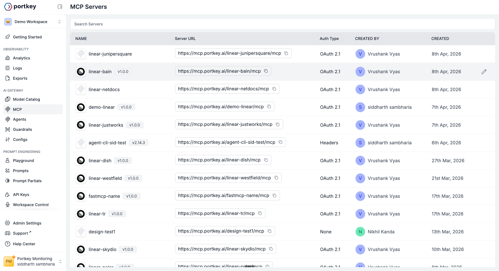 Portkey's MCP Registry solves the same distribution problem for tools. Add MCP servers to your Portkey workspace with centralized auth -- OAuth, client credentials, or static headers -- and the Portkey CLI writes the correct configuration to each engineer's agent on setup.