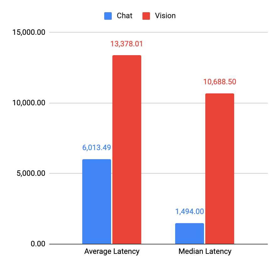 - The median (50 percentile) latency for a vision model request is 7x that of a chat model! (and it goes even higher for tail-end queries)