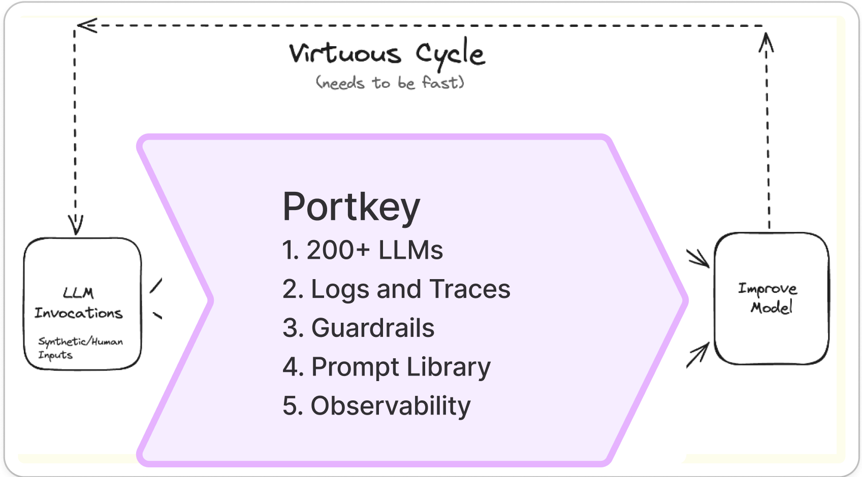At Portkey, we've built tools to accelerate this virtuous cycle. Portkey's features tackle each part of Hamel's cycle, transforming the slow, manual process of refining agents into a fast, automated Ferrari.