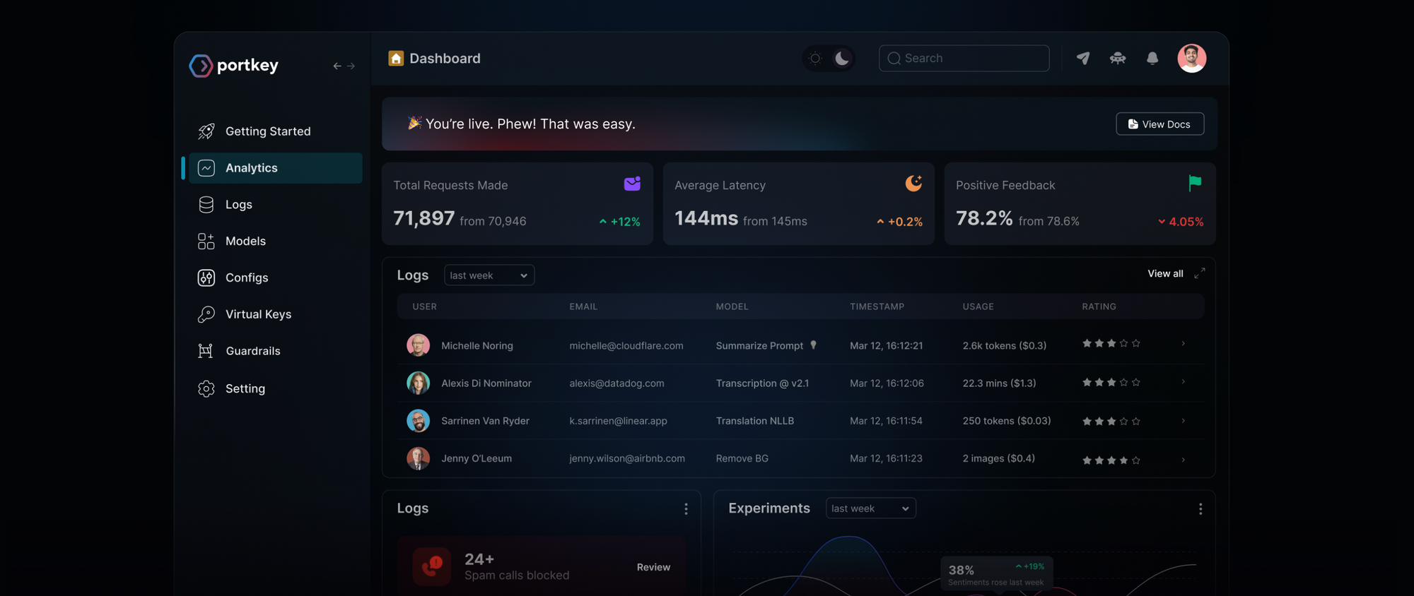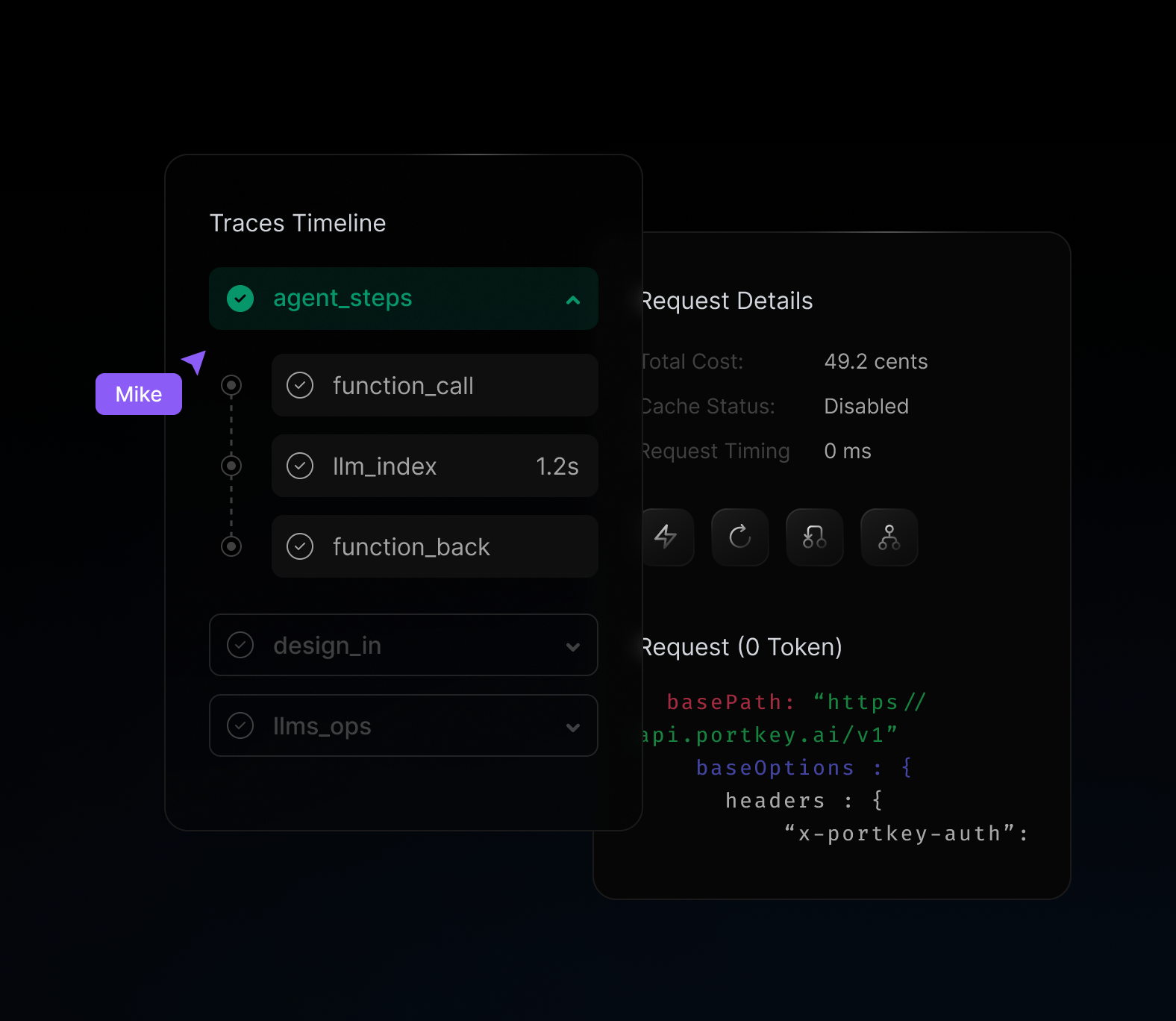 Portkey's traces-and-logs view acts as your AI detective kit. Our traces-and-logs view offers X-ray vision for your agent. Track every decision and action. Identify and solve problems in seconds. No more guesswork – just clear, actionable insights to refine your agent's performance.