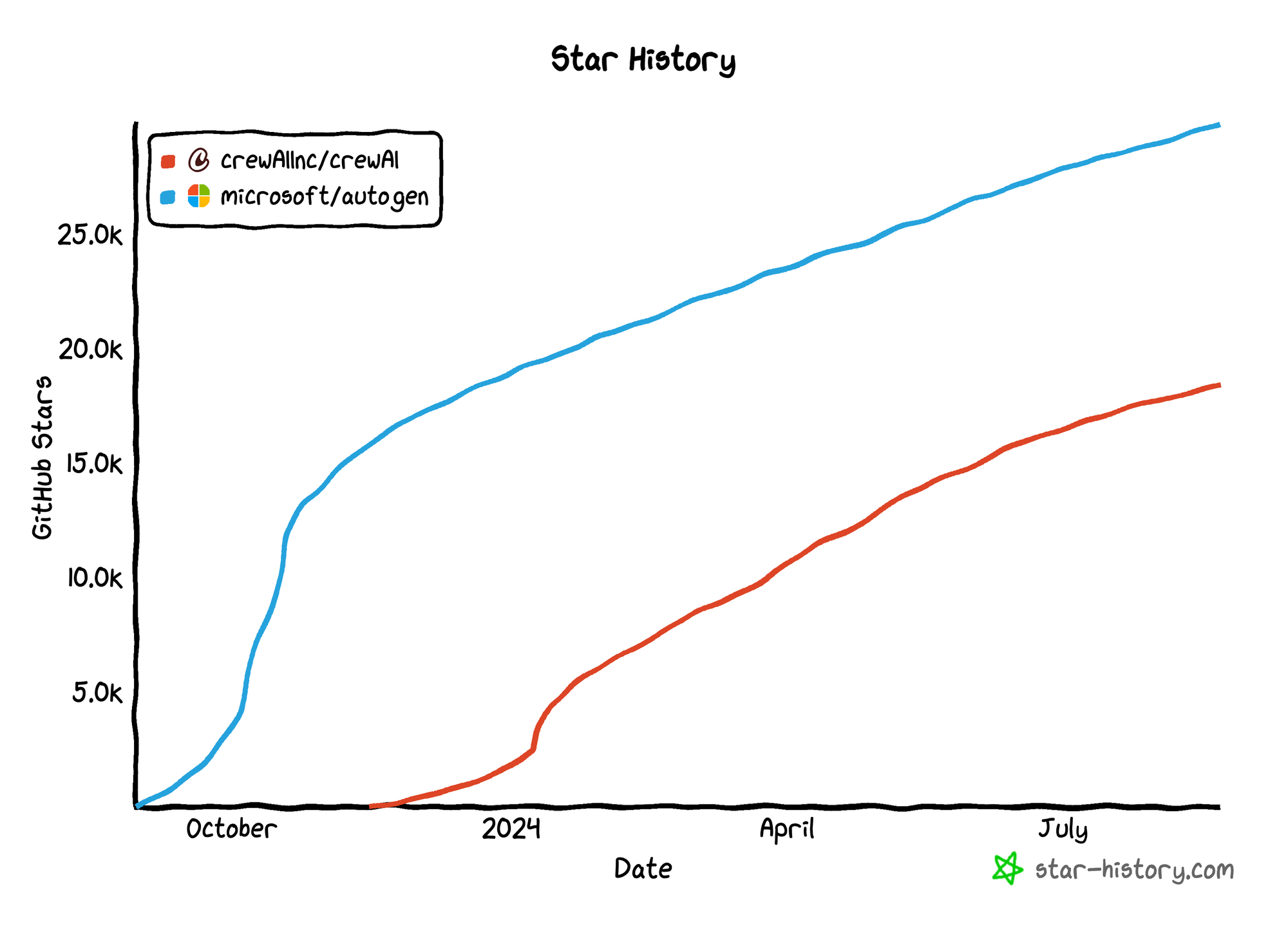AI Agents are here, and the number of companies using and building agents is growing rapidly. Just take a look at this Github star history for CrewAI & Autogen: