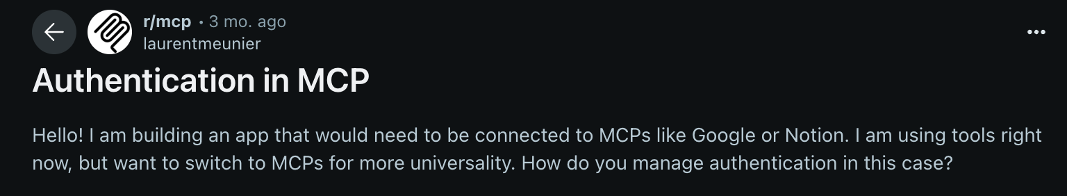 With every server requiring its own keys or tokens, teams quickly accumulate dozens of credentials to distribute, rotate, and revoke. The operational burden grows linearly with the number of servers. - Agents can’t “log in”: OAuth flows are designed for humans, not LLMs. While a user can click through a redirect and approve access, an agent can’t. This leaves developers either weakening security (hardcoding keys) or building extra orchestration layers to manage credentials on behalf of agents.