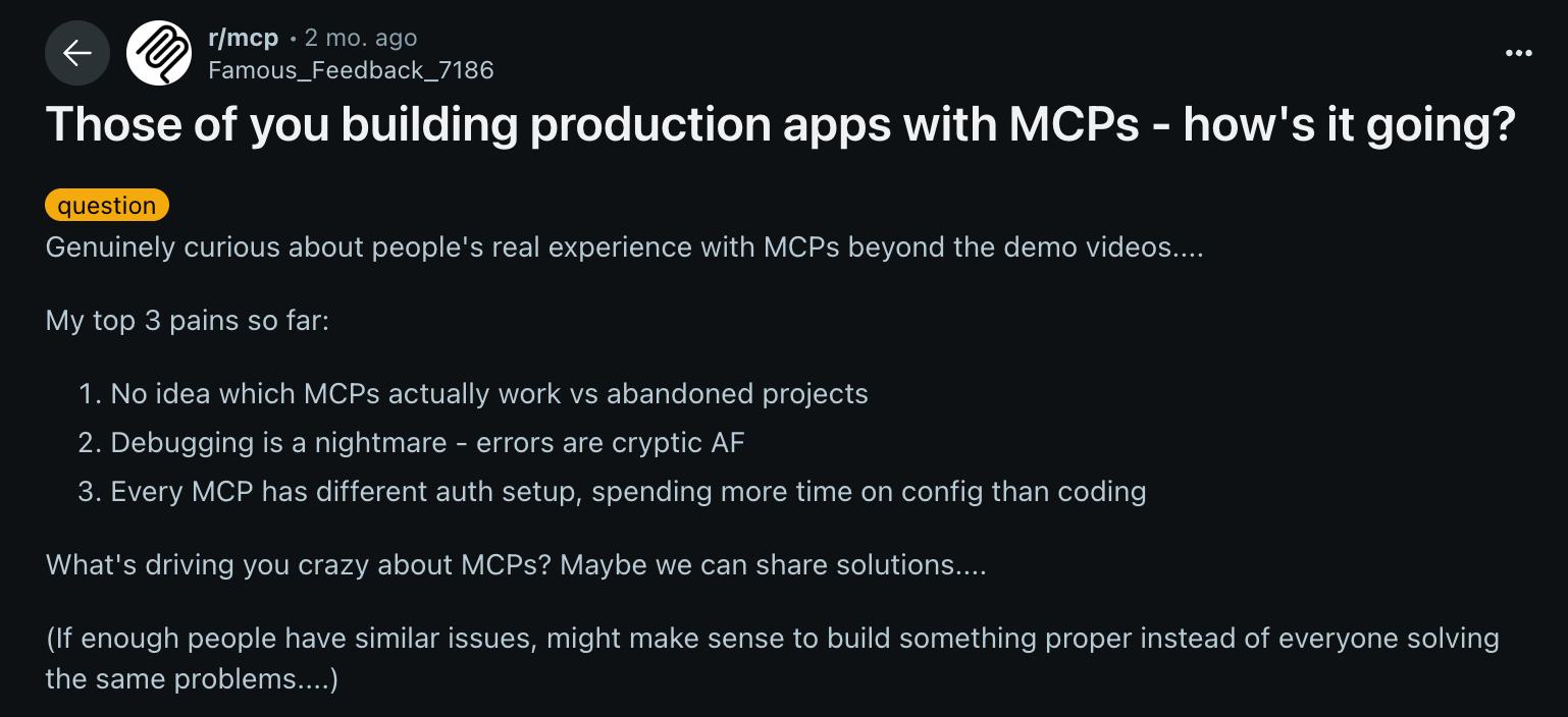 - Adoption slows down: Even when the technical integration is simple, the authentication hassle discourages teams from adding more MCP servers. What should be a flexible, composable ecosystem instead becomes fragmented and hard to scale.