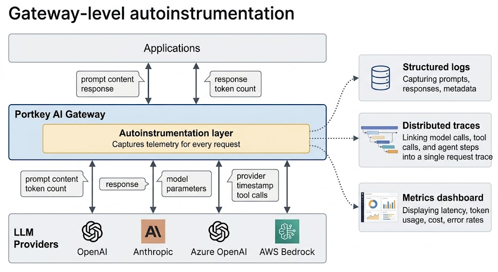 Portkey's AI Gateway implements autoinstrumentation at the infrastructure layer, capturing telemetry at every LLM request that passes through it without requiring changes to your application code. This includes prompts, responses, token usage, latency, model parameters, and provider information.
