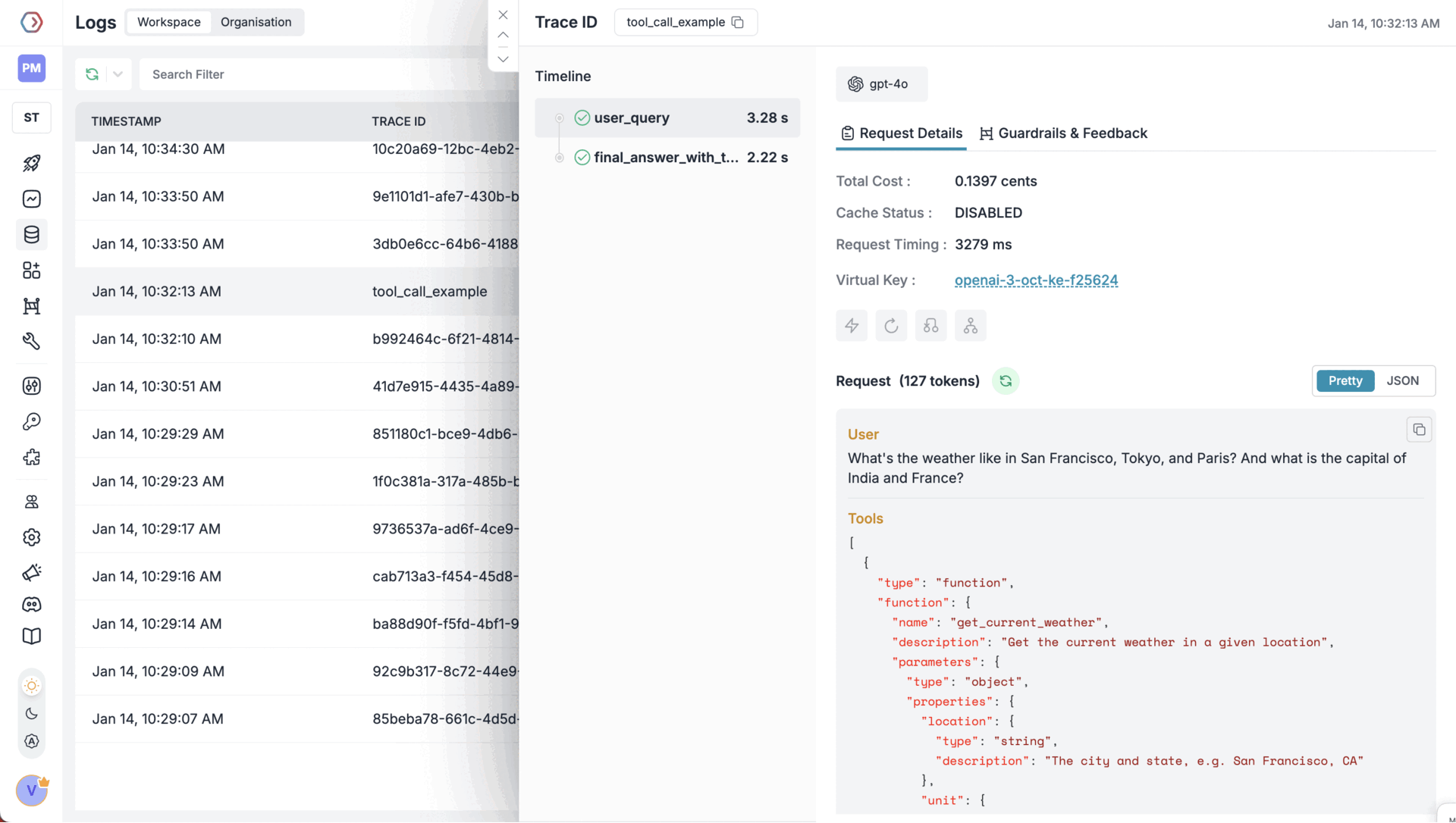Portkey captures detailed traces for every LLM call and tool interaction: