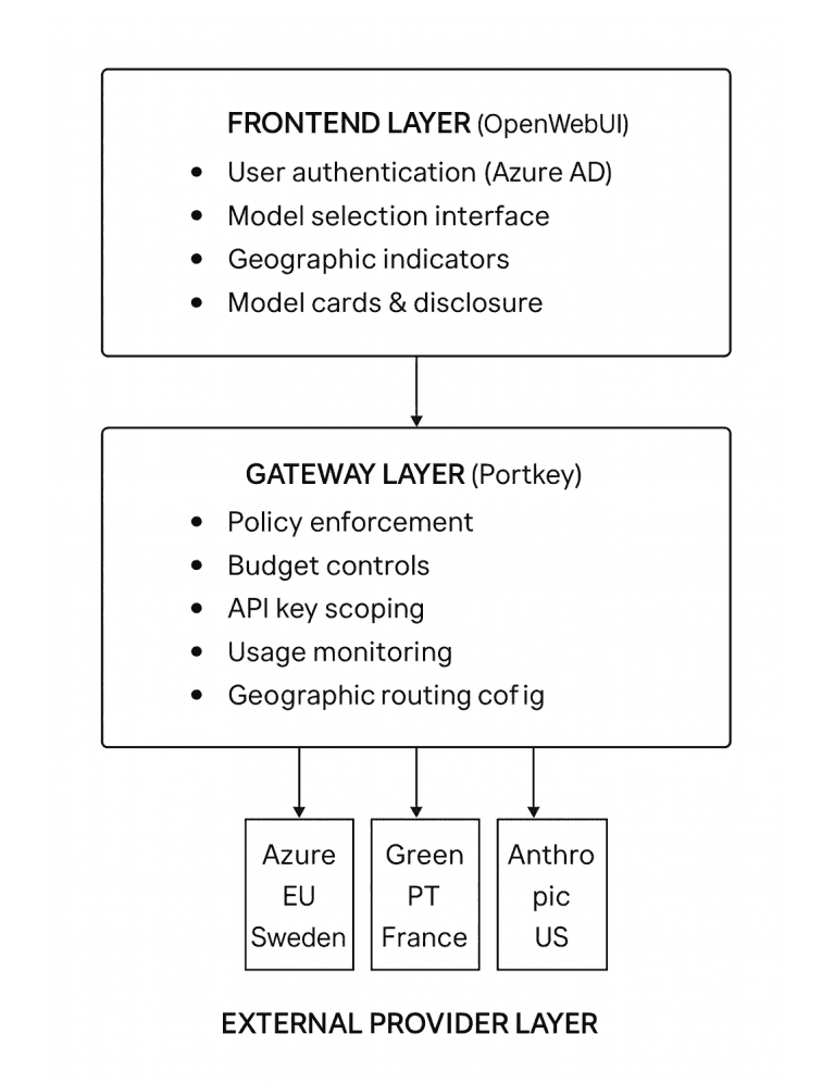 A provider layer connecting to commercial providers, EU-hosted infrastructure (Azure AI Foundry), and self-hosted models