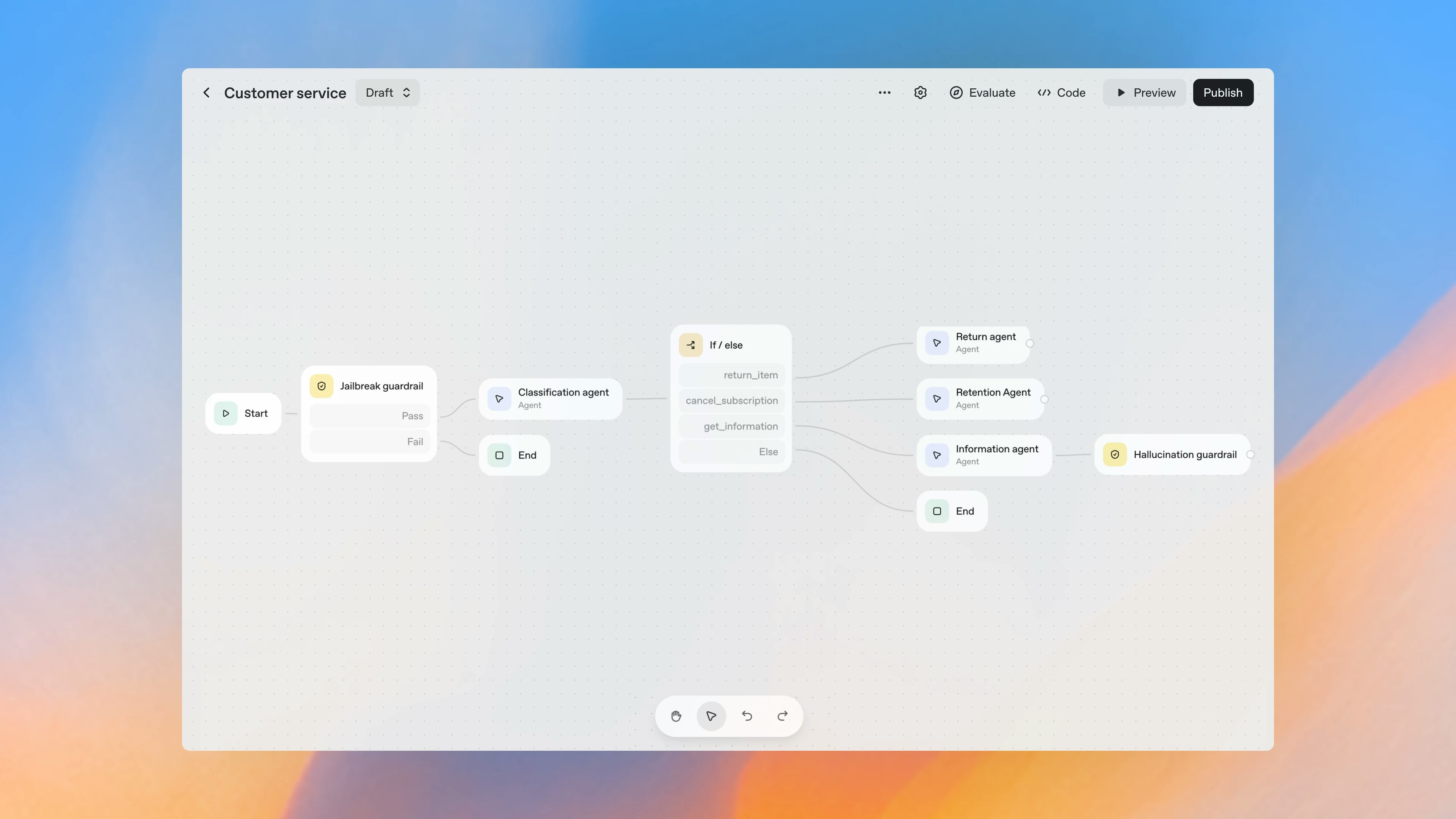 OpenAI Agent Builder is a visual canvas for creating multi-step agent workflows. With its drag-and-drop interface, you can design complex agent workflows, test them with live data, and export production-ready code. Portkey seamlessly integrates with Agent Builder’s exported code, adding enterprise features like:- Complete observability of your agent workflows