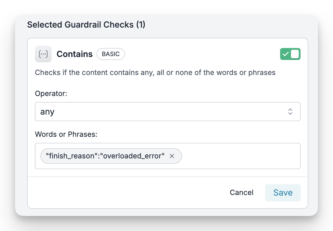 We’ll use Portkey’s Output Guardrails to inspect the content of the response stream. This allows us to create a rule that looks for the specificoverloaded_error